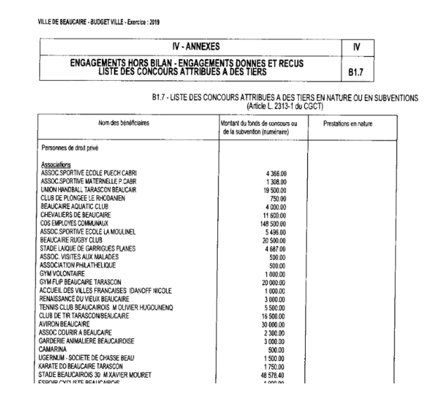 A notre connaissance, aucune nomenclature spécifique n’est demandée dans la complétion des subventions aux associations par les services municipaux. Certaines – rares – municipalités remplissent avec précision ces tableaux, mais très souvent les informations sont parcellaires. Une association peut avoir un certain nom une année, puis son acronyme l’année suivante, puis un nom plus proche de son objet l’année d’après. Cette normalisation des noms a été réalisée manuellement.